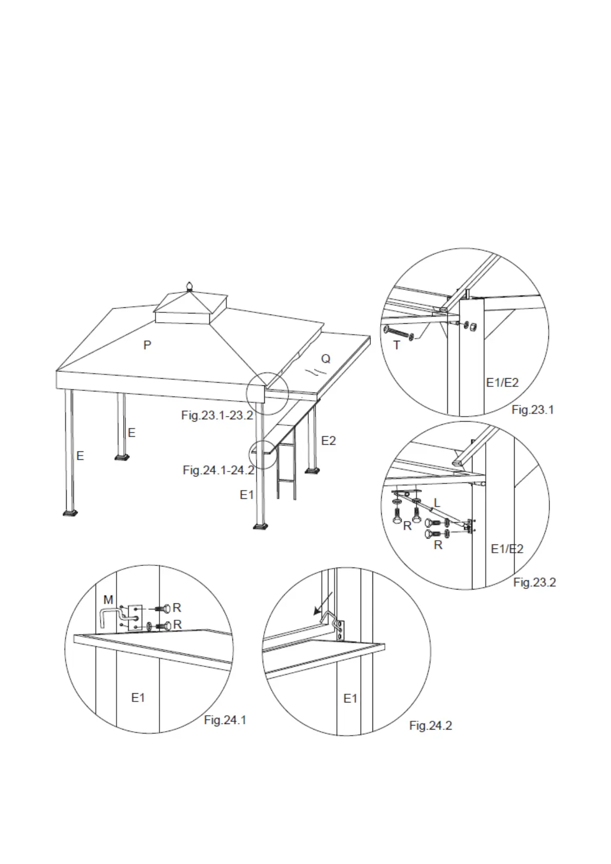 Step 13A: Connect the back of awning to Corner Posts (E1 and E2) using Bolt, Nut and Washer (T). See