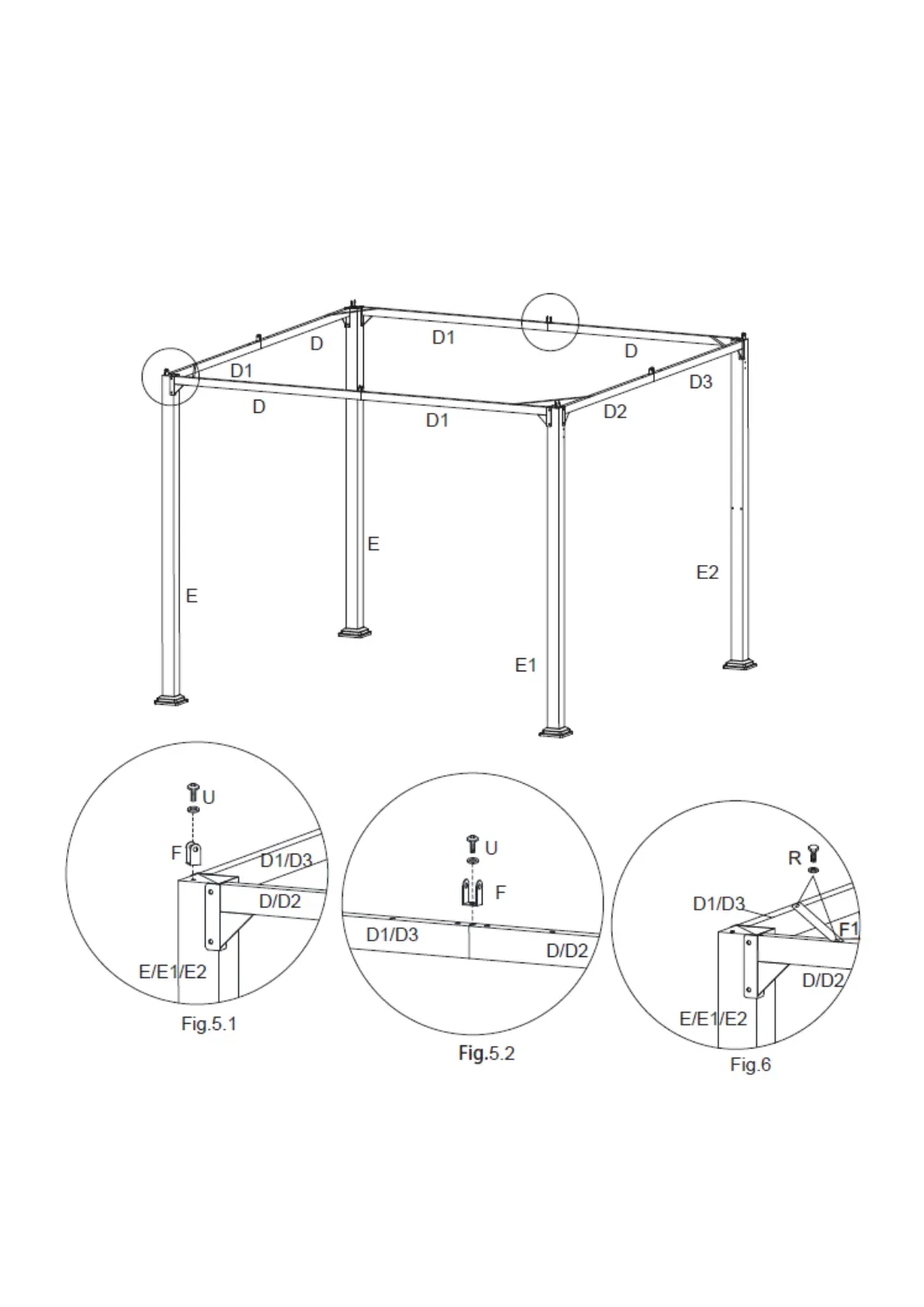 Step 4A: Connect the U-Shaped Connector (F) to the top of the Corner Posts using Bolt and Washer (U).