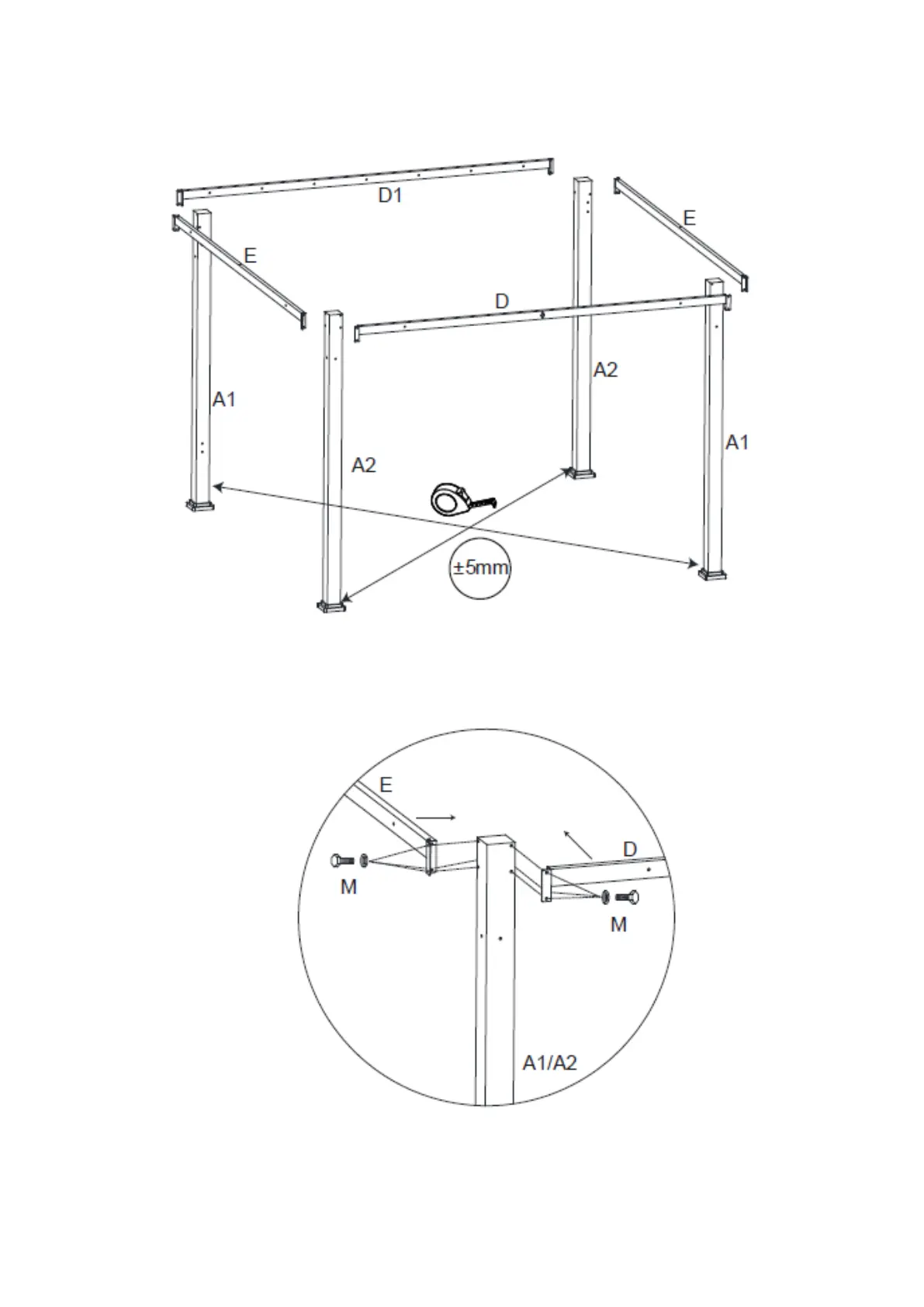 Step 2: Attach Side Lintel (E) and Front Lintel (D and D1) to the Corner Posts (A1 & A2) using Bolt (M).