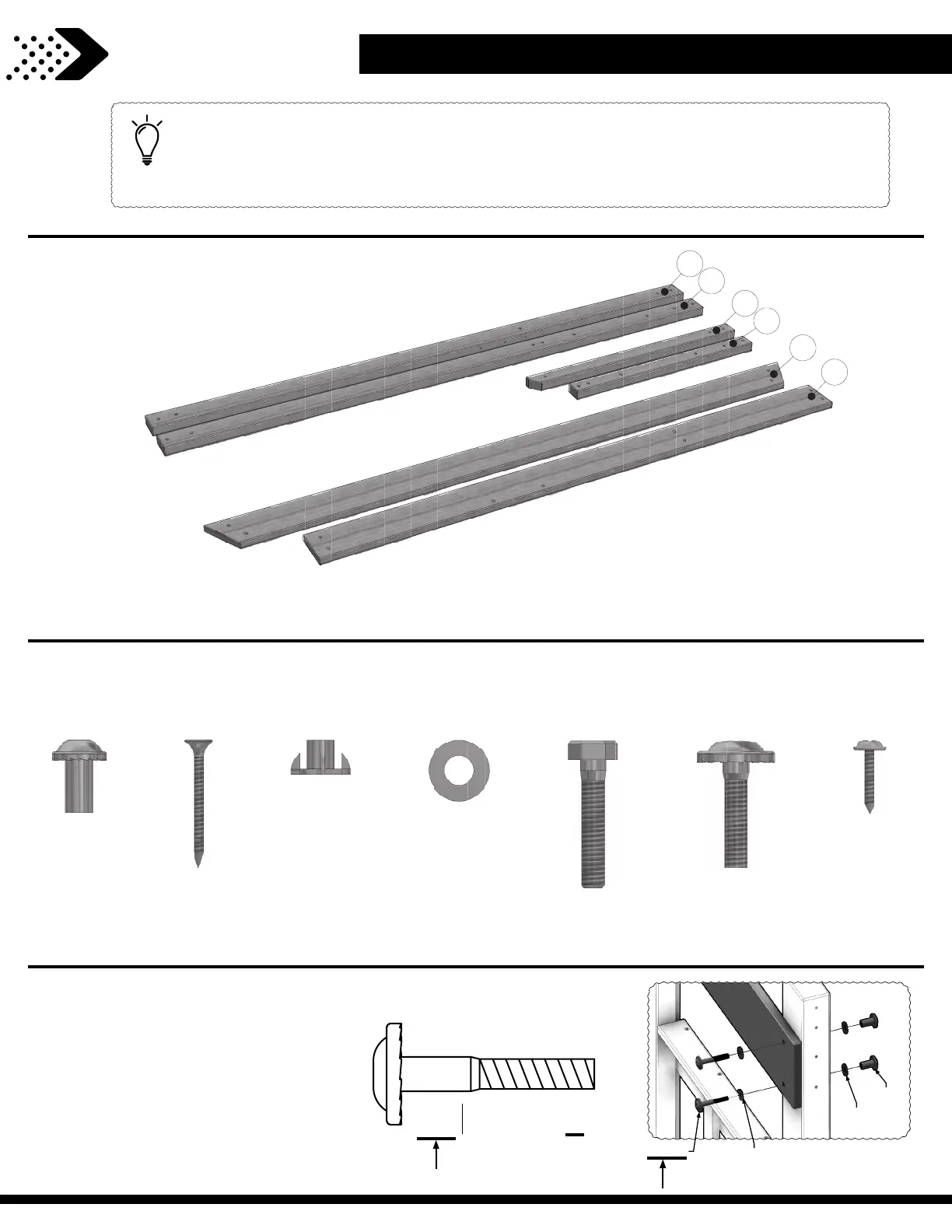 printed on the bags or by hardware type (i.e. bolts, nuts, etc.). Organizing your hardware will make assembly easier.