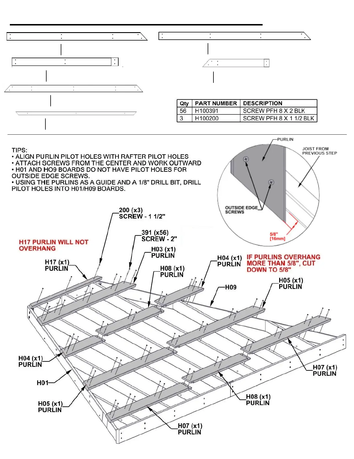 • ALIGN PURLIN PILOT HOLES WITH RAFTER PILOT HOLES
