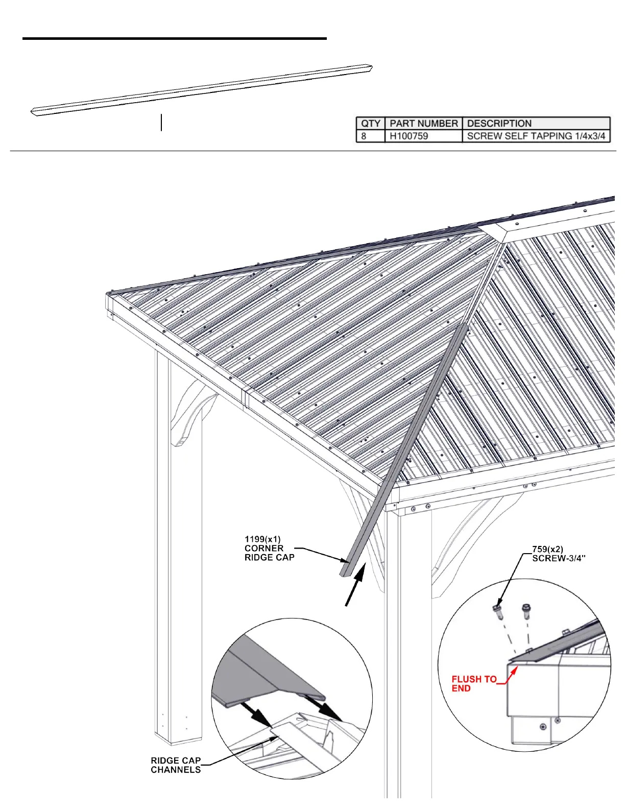 SLIDE CORNER RIDGE CAP ONTO ROOF RIDGE CAP CHANNEL AS SHOWN.