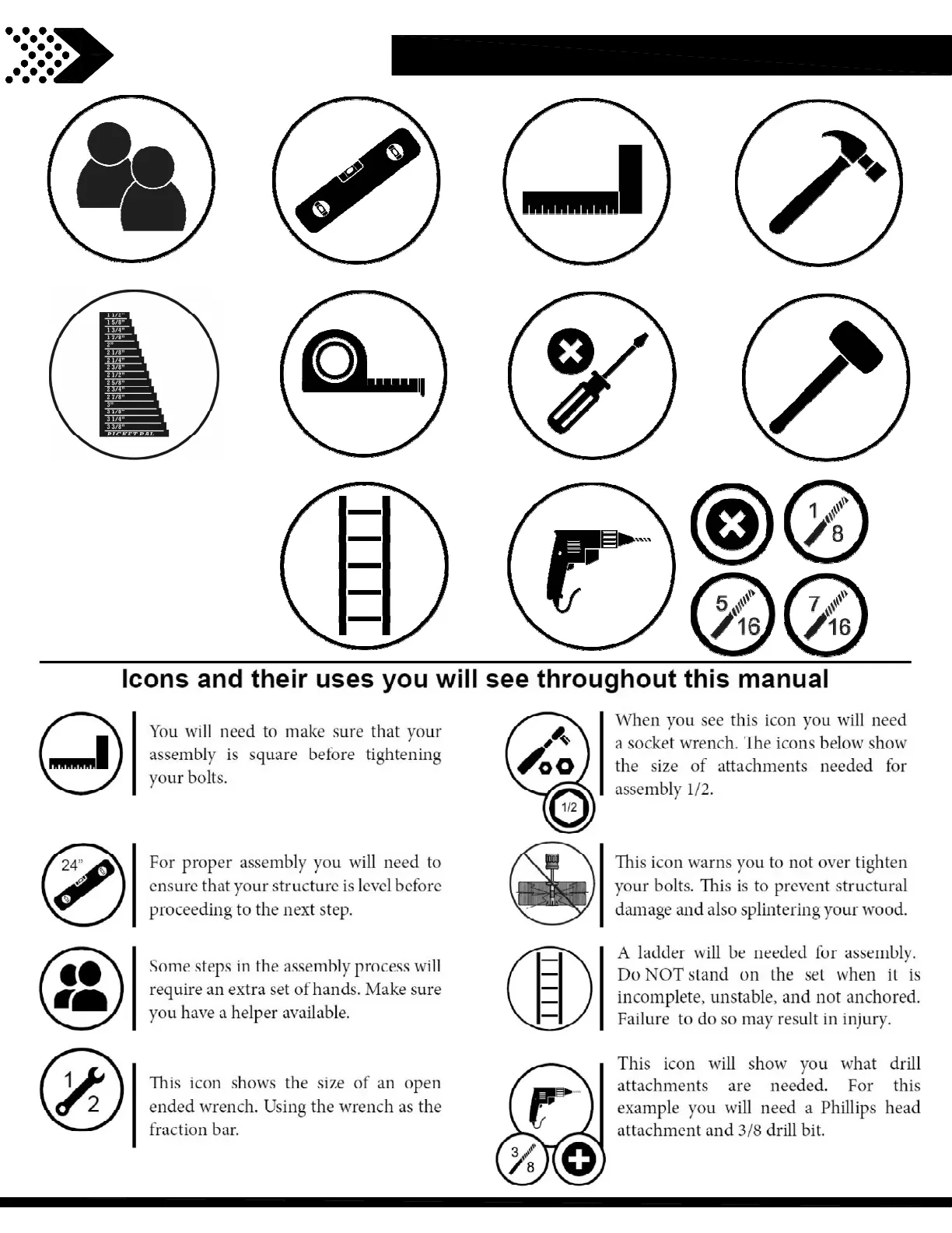 Backyard Discovery Echo Heights - Tools and Assembly Icons; Required Tools for Installation; Understanding Assembly Icons