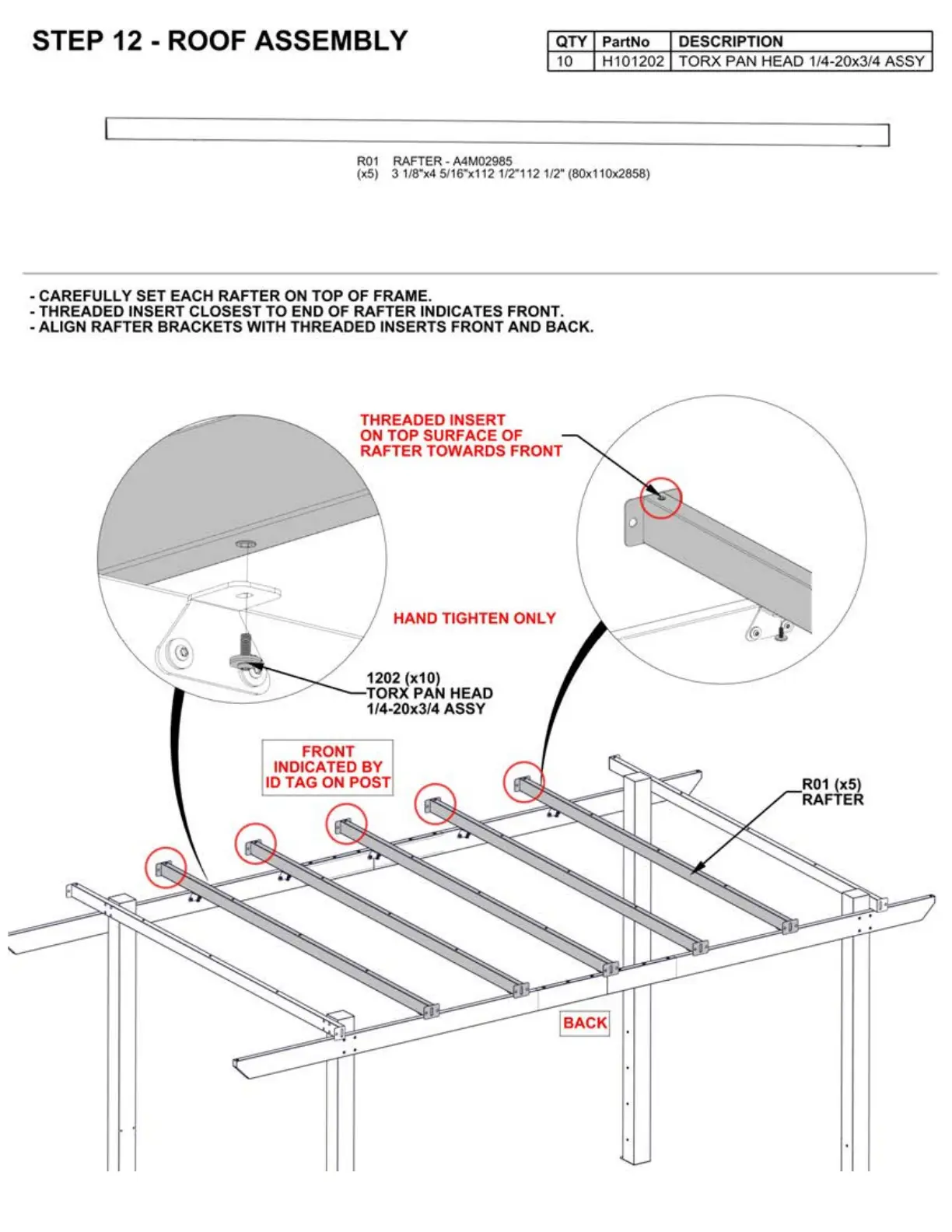 - ALIGN RAFTER BRACKETS WITH THREADED INSERTS FRONT AND BACK.