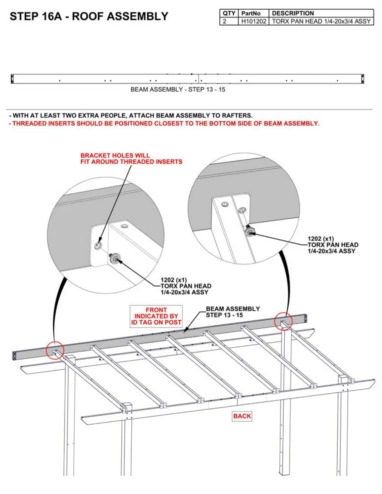 LEAST TWO EXTRA PEOPLE, ATTACH BEAM ASSEMBLY TO RAFTERS.
