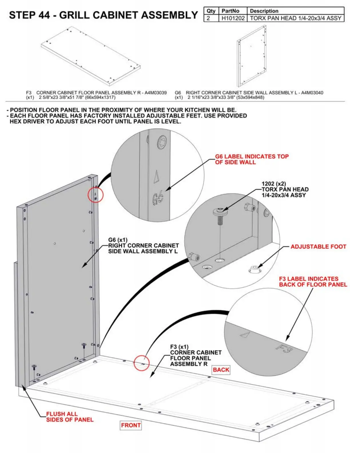 F3 CORNER CABINET FLOOR PANEL ASSEMBLY R - A4M03039 G6 RIGHT CORNER CABINET SIDE WALL ASSEMBLY L - A4M03040