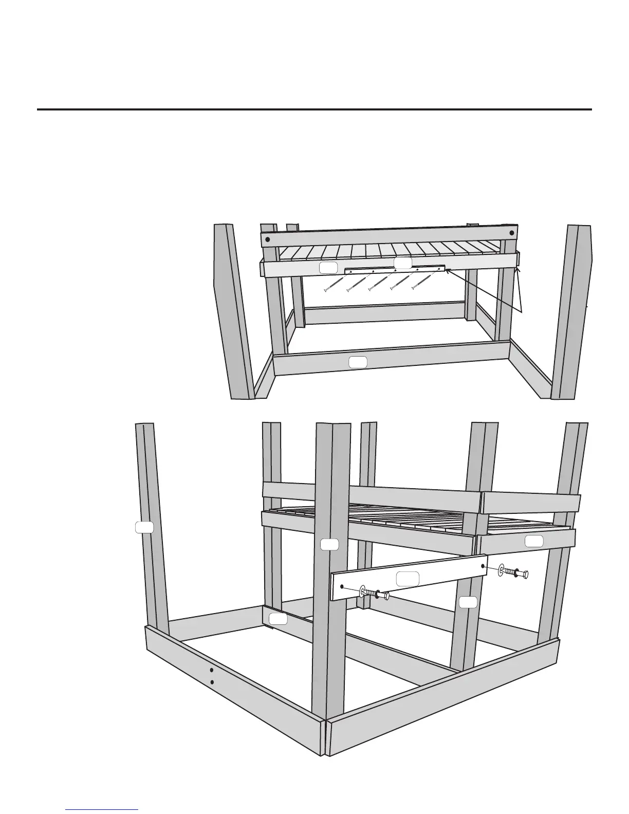 Attach T1 Picnic Table Support flush with bottom of H6 Floor Rail and 18-1/4” from edge of H6 with 1-1/2” Wood Screws.