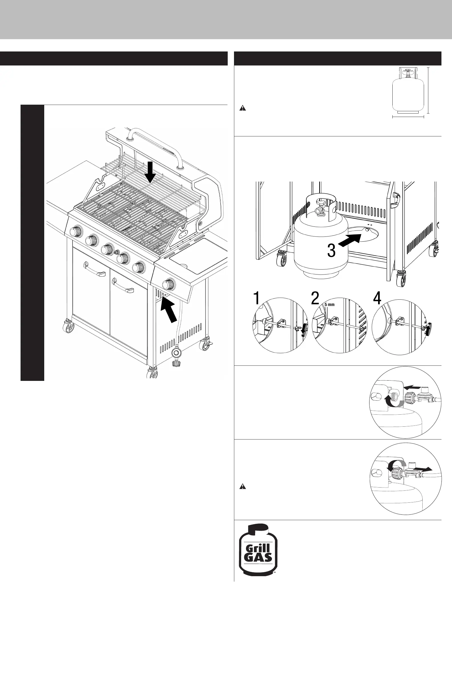 Place precision will LP gas tank upright into hole in grill body so the tank valve is facing the gas