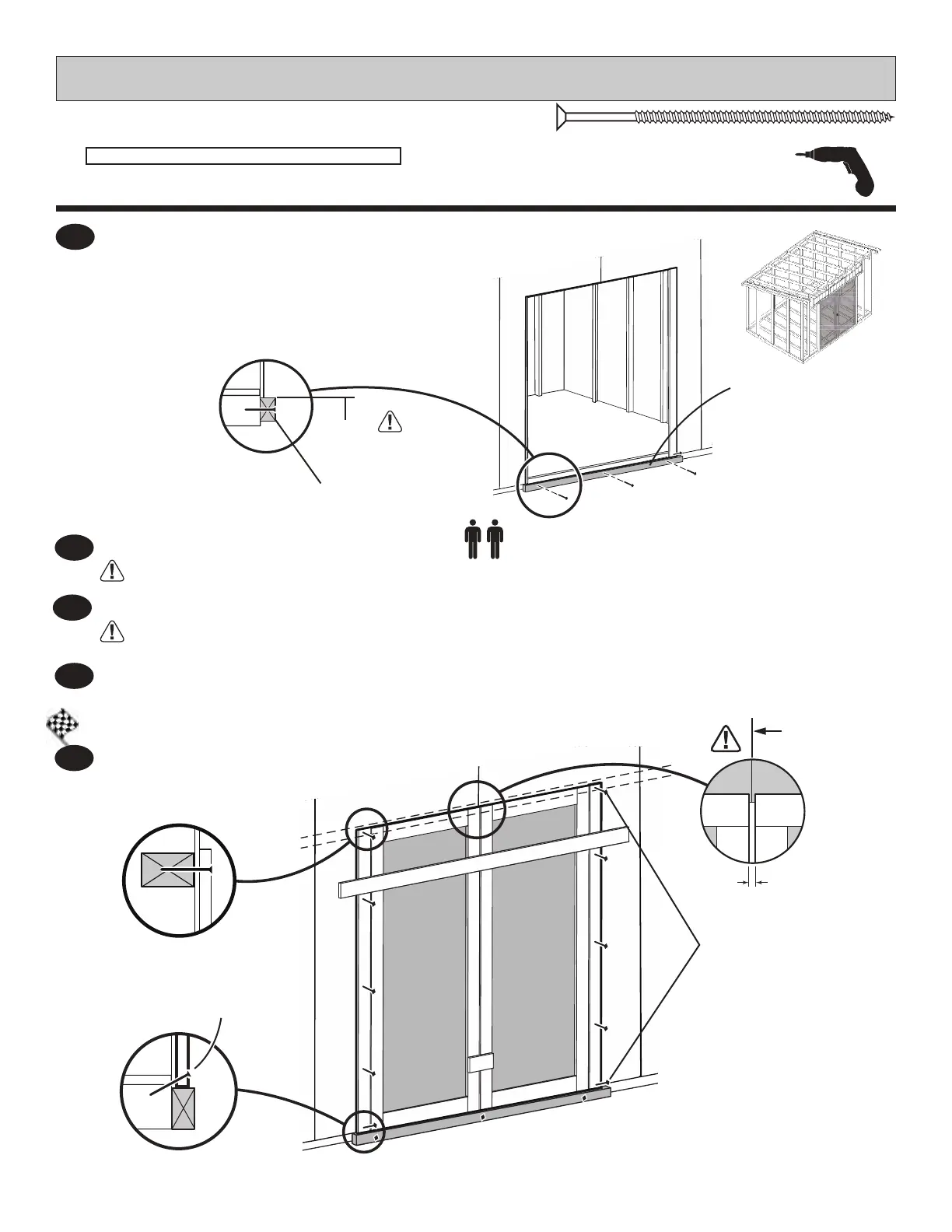 Screw hinge boards into wall frame and oor using ten 3" screws as shown.