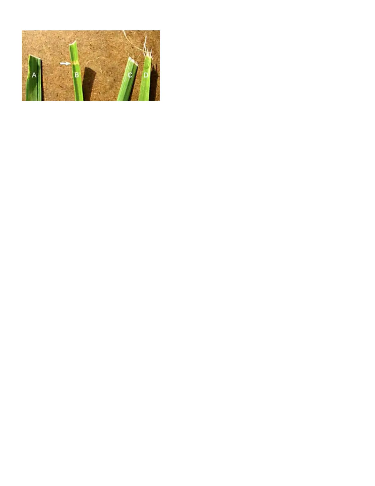 • Leaf blade B demonstrates a leaf blade that was injured by a dull mower blade.