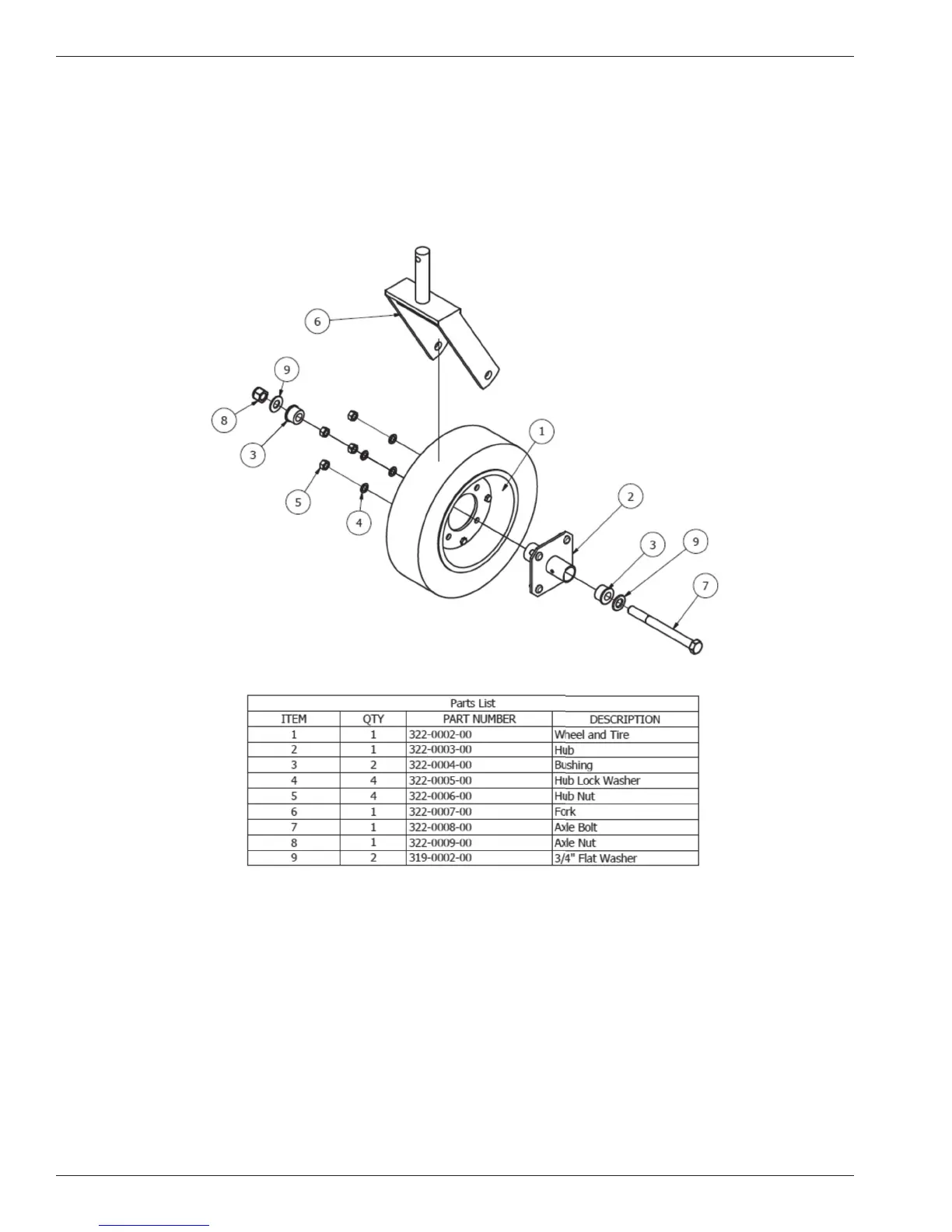 Flat Washer (9); Hub (2); 3/4˝ Flat Washer (9); remaining hole of Fork (6). Secure with 3/4˝ Axle Nut