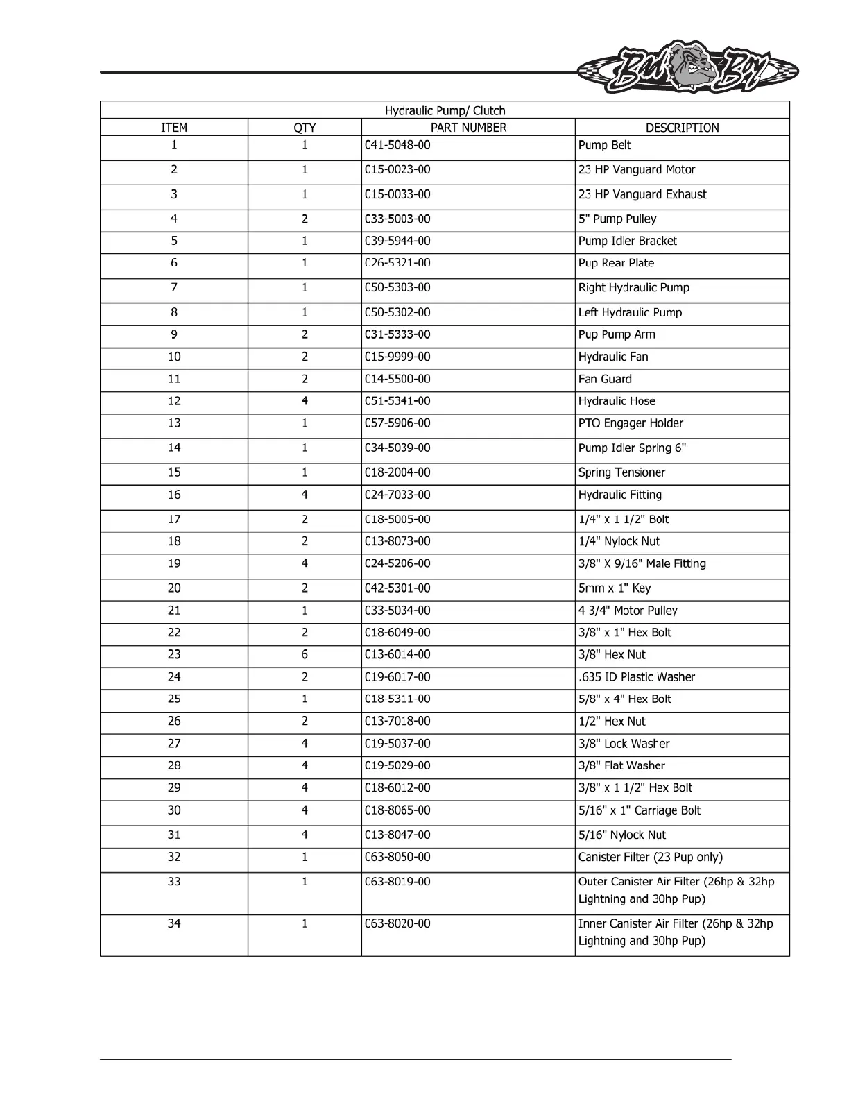 Bad Boy PUP - Hydraulic Pump and Clutch Components; Hydraulic Pump;Clutch Parts List