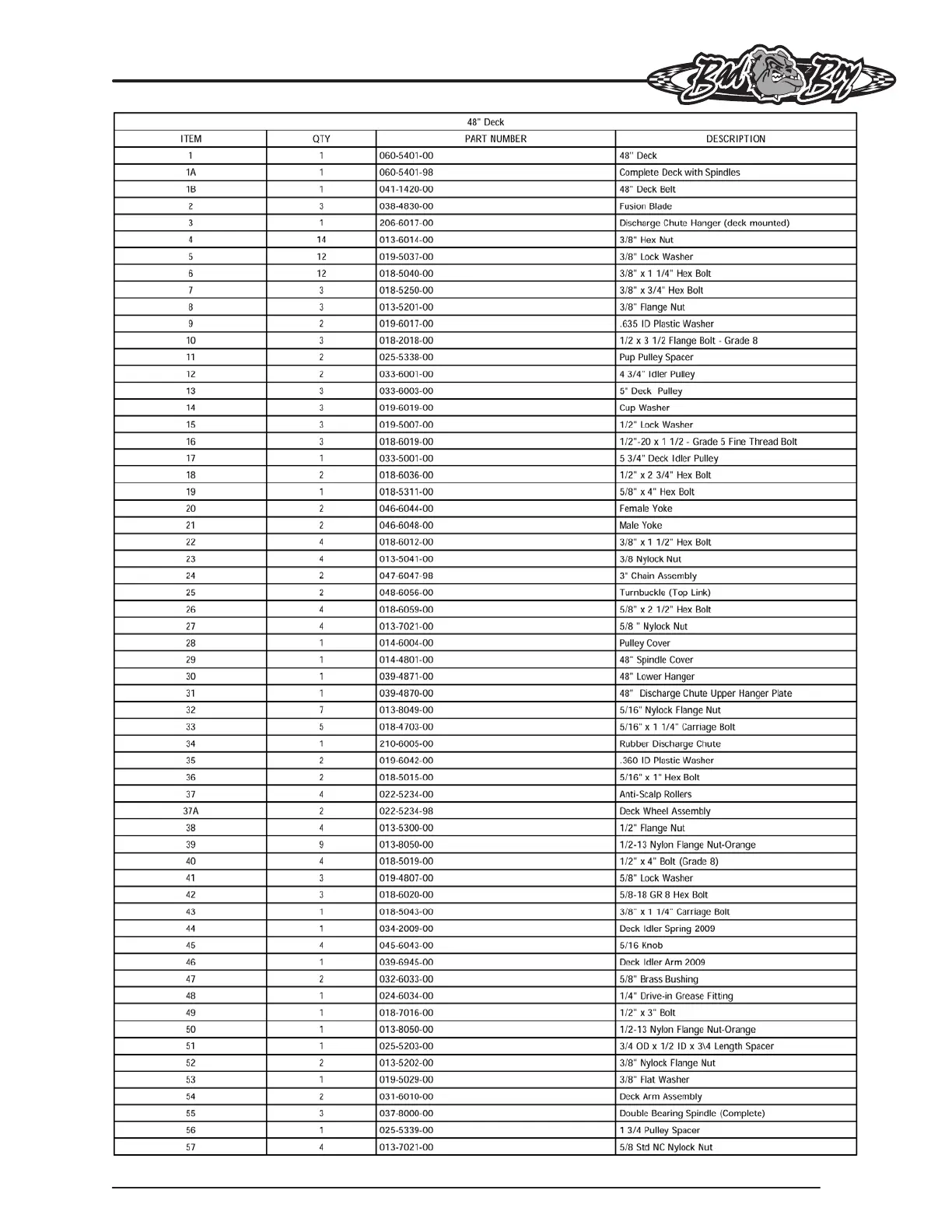 Bad Boy PUP - 48-Inch Deck Components; 48-Inch Deck Parts List and Diagram