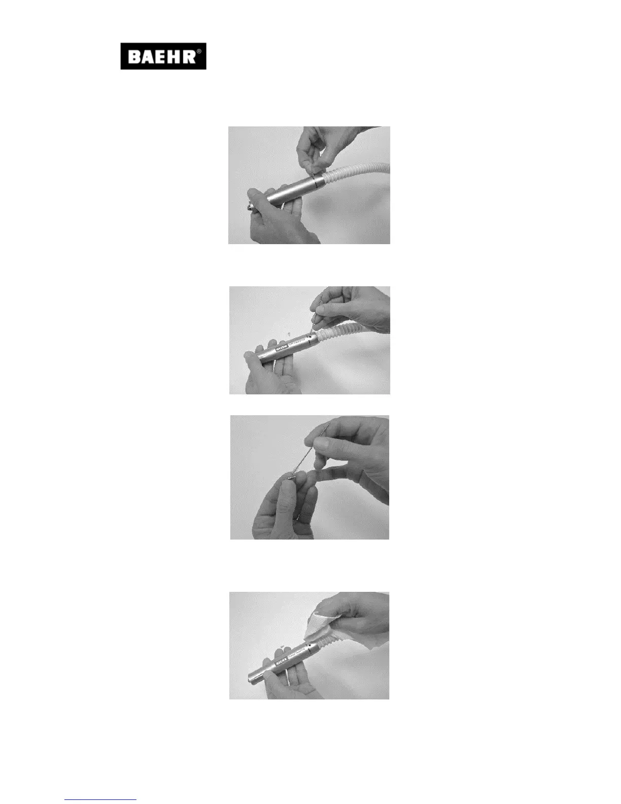 Next, wipe the button pusher and button housing with Baehr quick surface disinfectant (Art