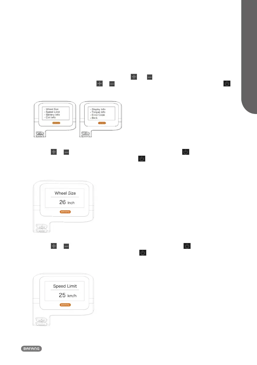 Press the or button (<0.5S) to highlight “Wheel Size”, then press the button (<0.5S) to