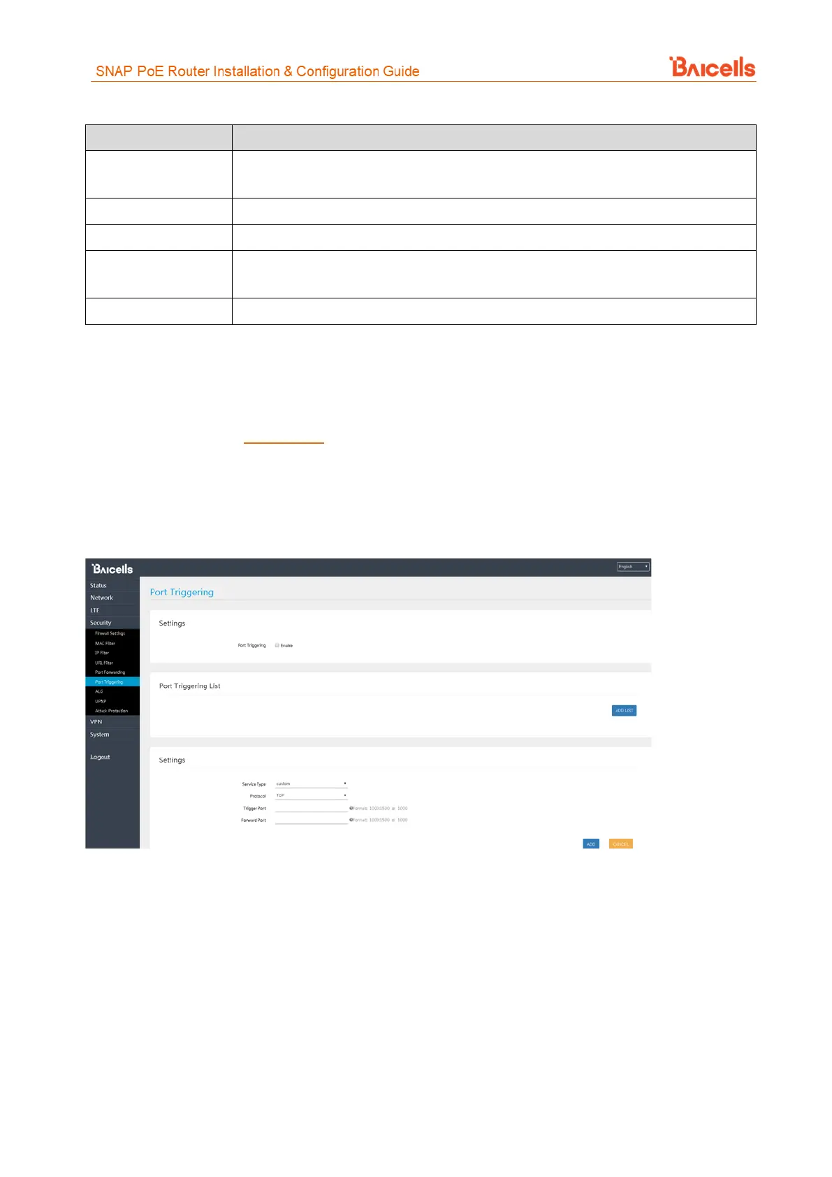 Port Triggering is a configuration option on a router - in this case, the CPE - if it is operating in NAT mode as