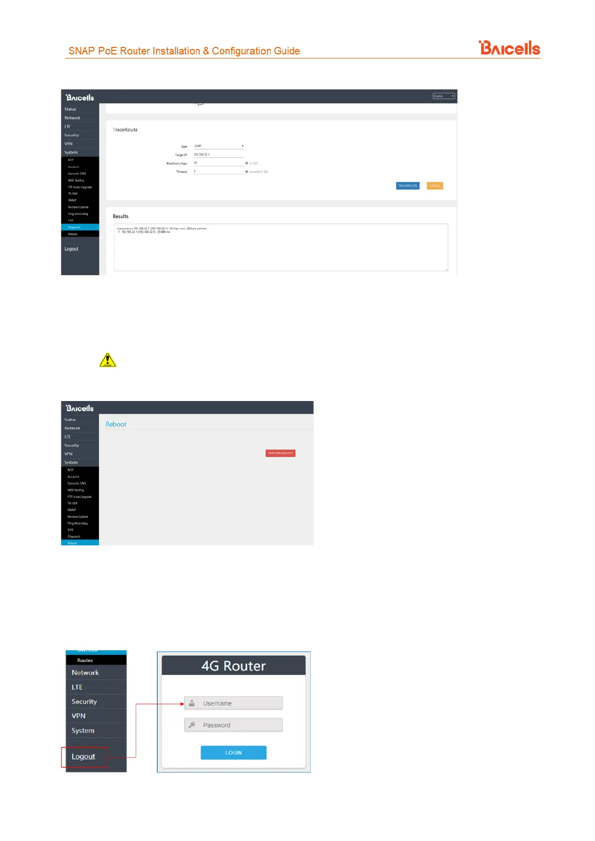 When you click on the Logout menu, you are automatically logged out of the CPE and returned to the login