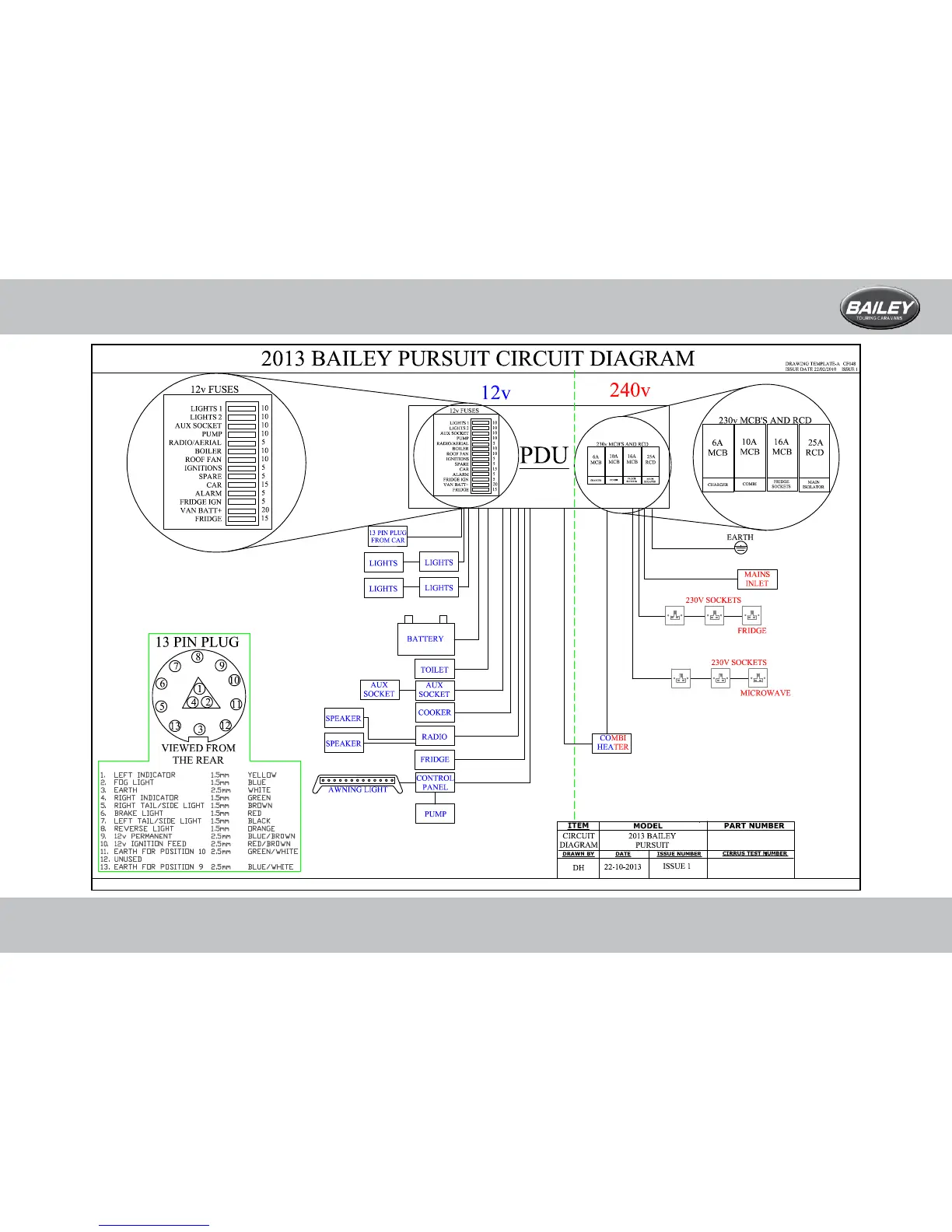 Bailey Unicorn 2 - 2013 Bailey Pursuit Circuit Diagram; 12 v Fuses and Connections; 240 v MCBs and RCD; 13 Pin Plug Wiring