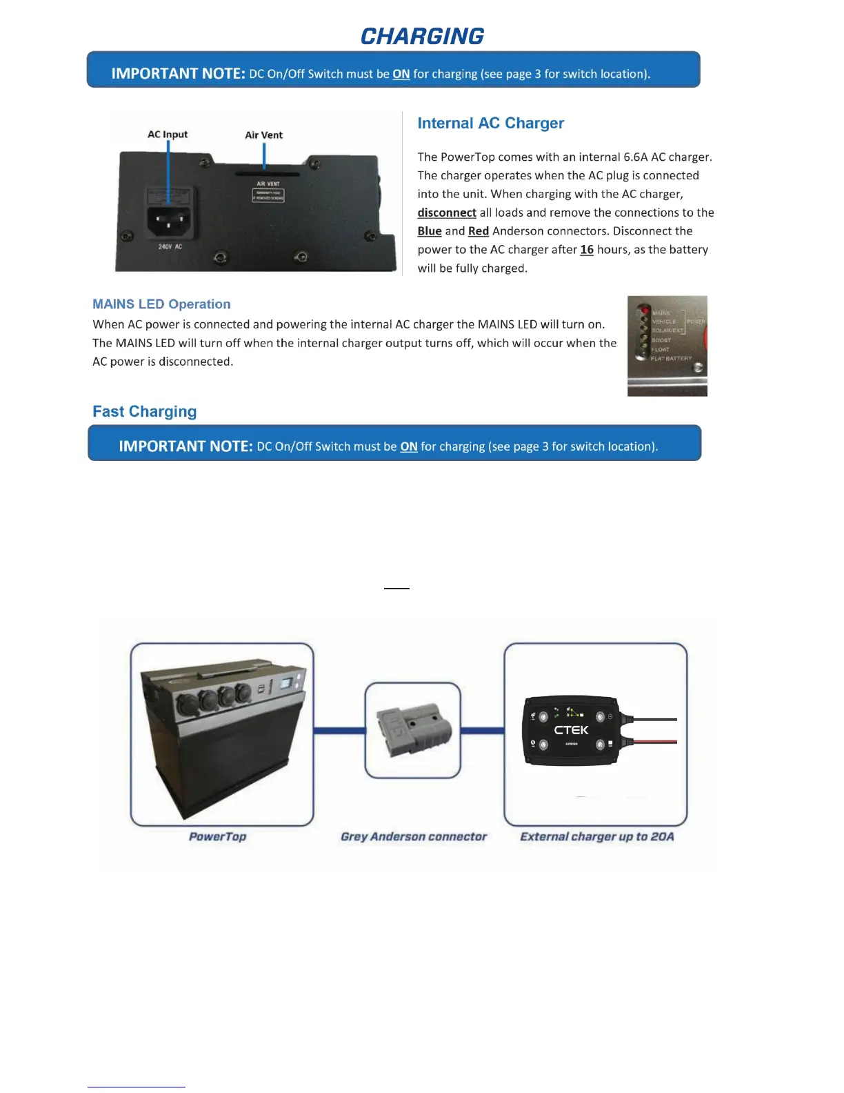 Baintech PowerTop V3 - Charging; Internal AC Charger; MAINS LED Operation; Fast Charging