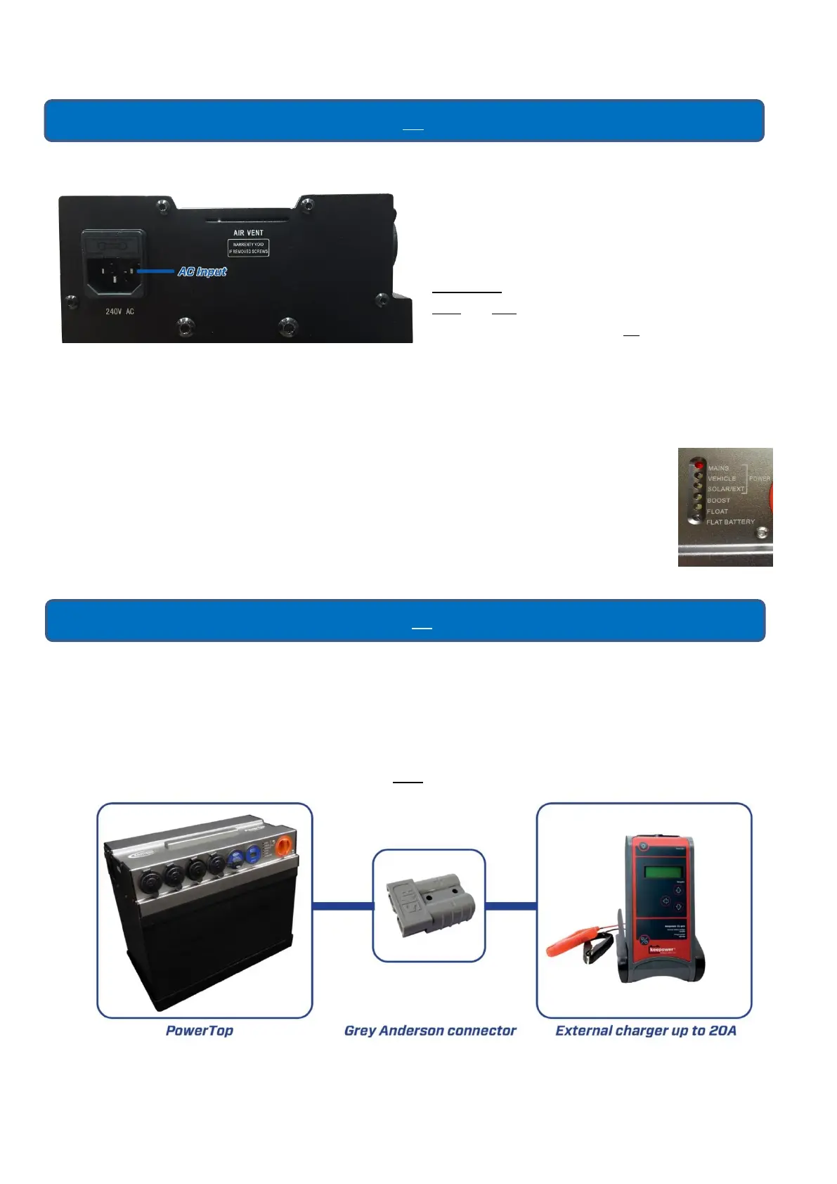 The external charger is to be connected to the Grey Anderson connector labelled 50A Battery Output.