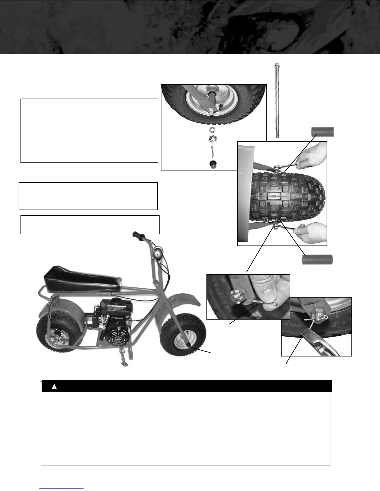 Riding minibike without cotter pins installed increases the risk of front and/or rear