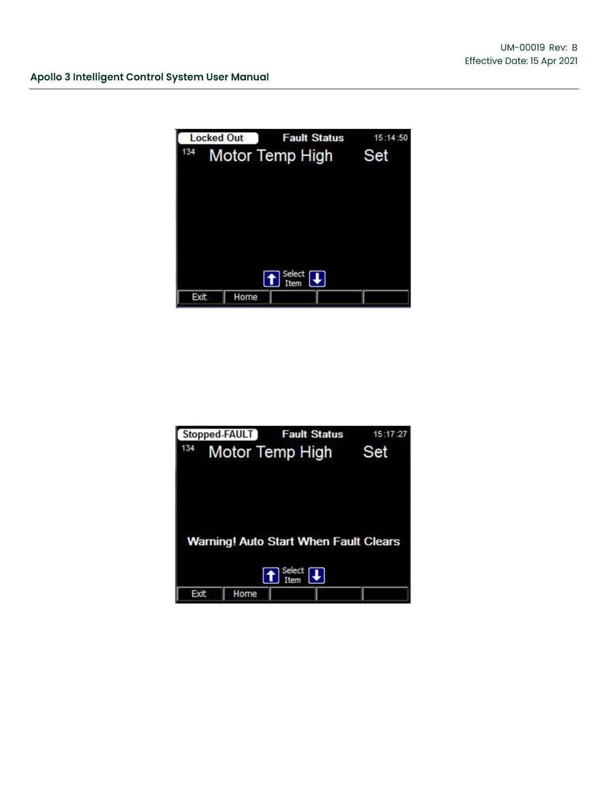 On a state transition to Restart, the Fault Status screen is automatically displayed.