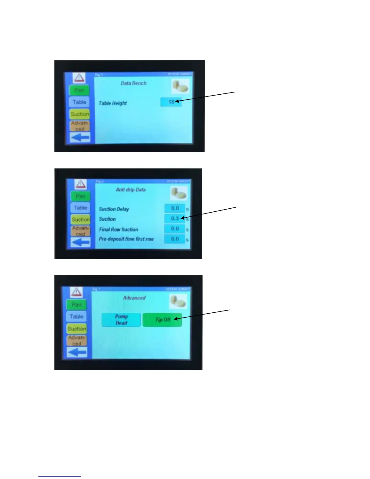Bakon DROP TT - Adjusting Table Height; Adjusting Suction Settings; Advanced Settings (Tip Off)
