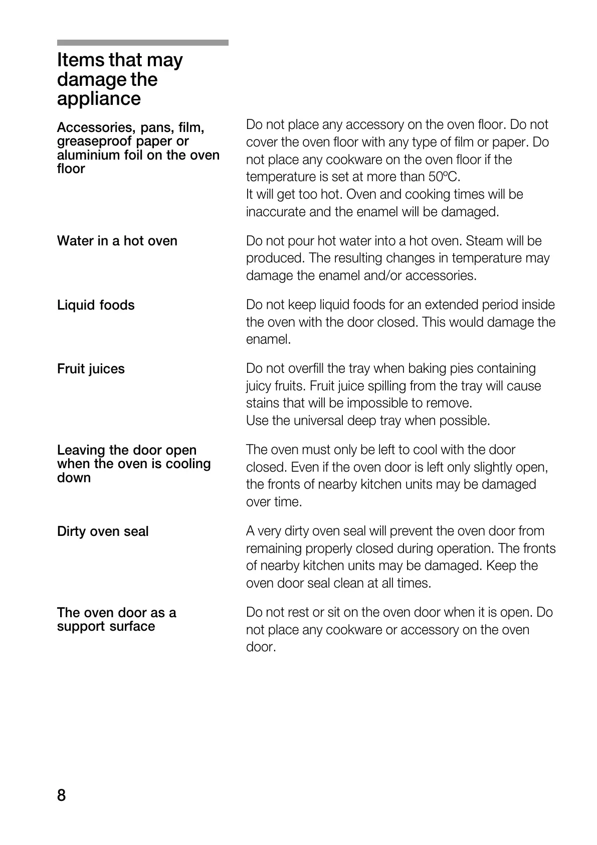 BALAY 3HB558XP - Items that May Damage the Appliance