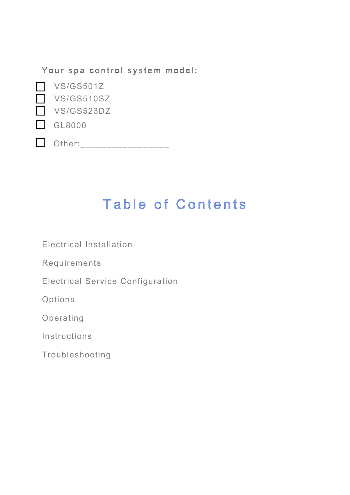 Balboa VS501Z - Table of Contents