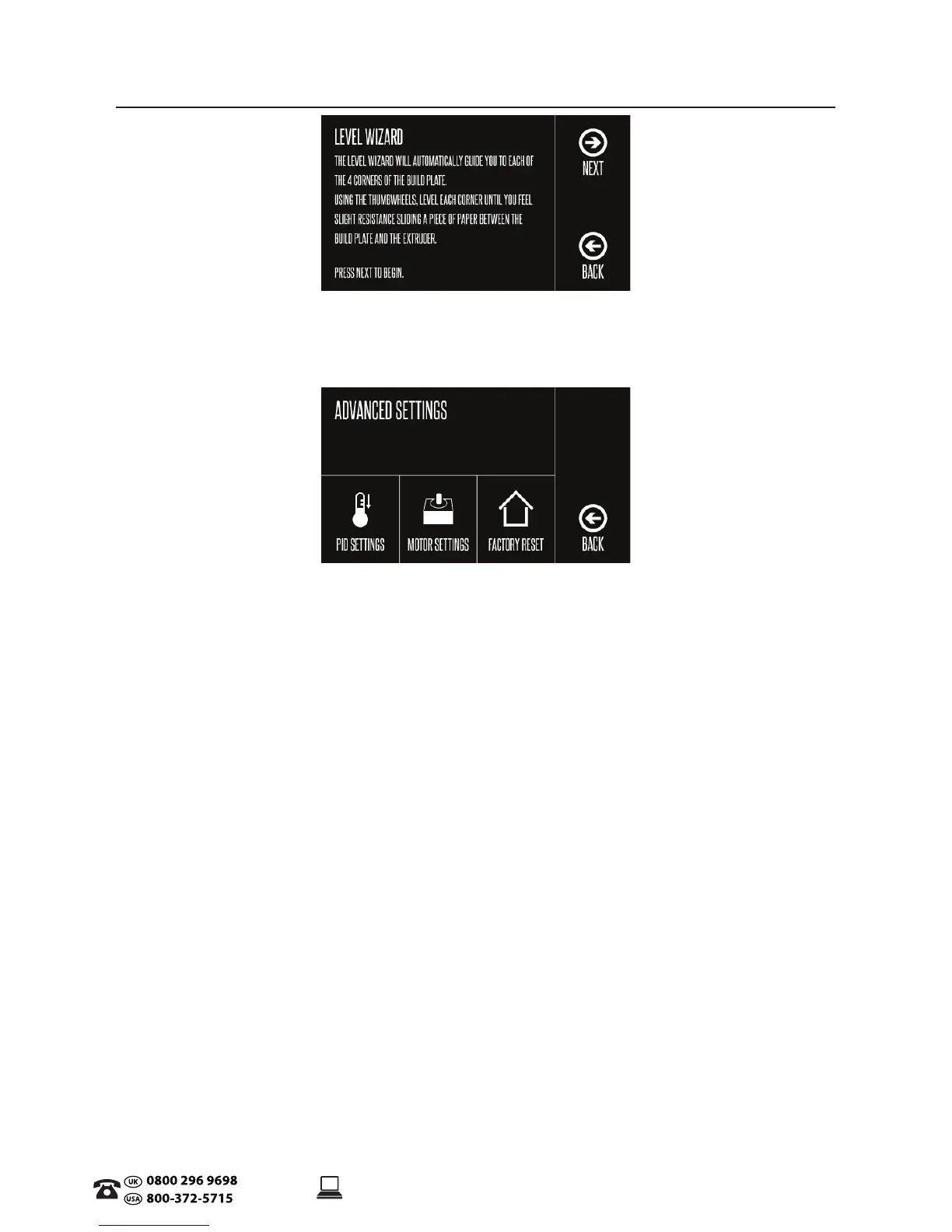 Follow instructions on the touch screen for levelling the Print Bed