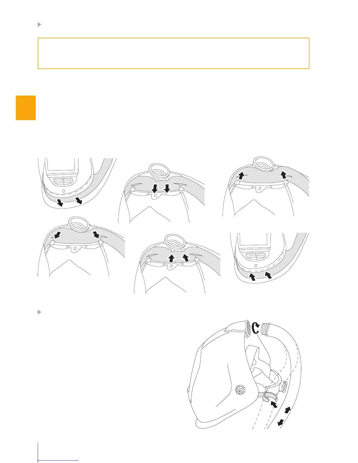 Zasuňte spodní část držáku obličejového těsnění do mezery mezi kuklou a vzduchovodem (6.).