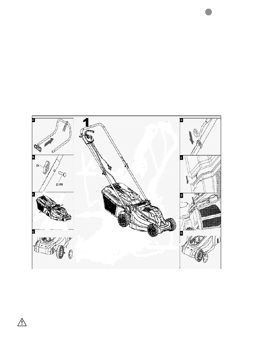 5. Insert the screws into the upper grass collection and frame handle (Fig. 1h).