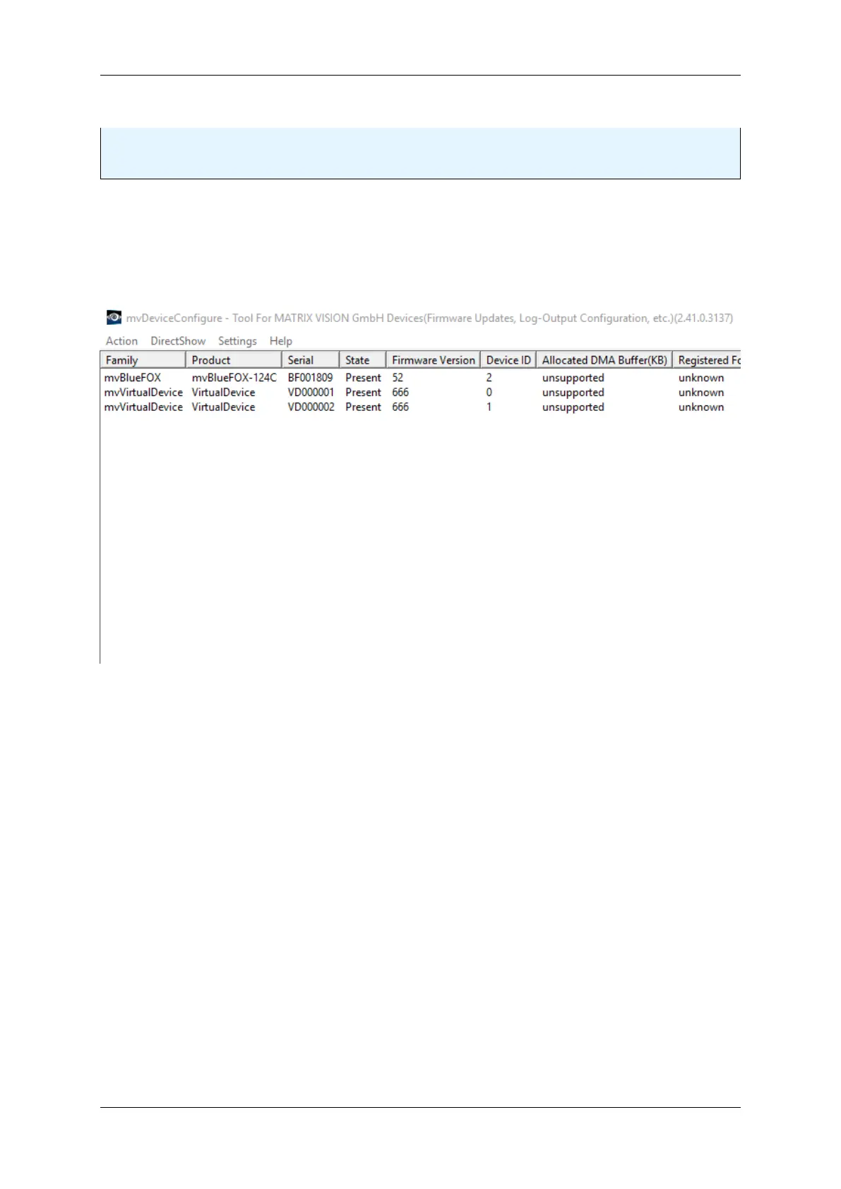 You can check if the driver installation was successful by using mvDeviceConfigure (p. 68). Supported device with