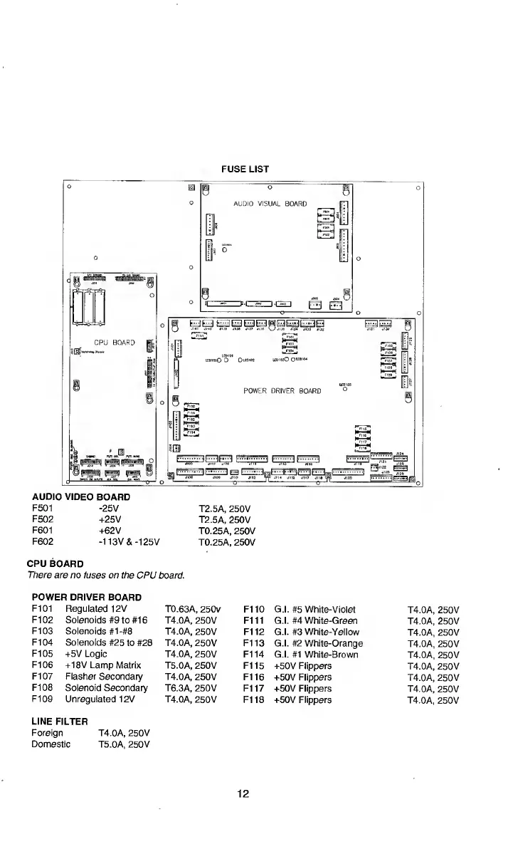 Bally ATTACK FROM MARS - Fuse List and Specifications; Power Driver Board Fuses; Audio Visual and Line Filter Fuses