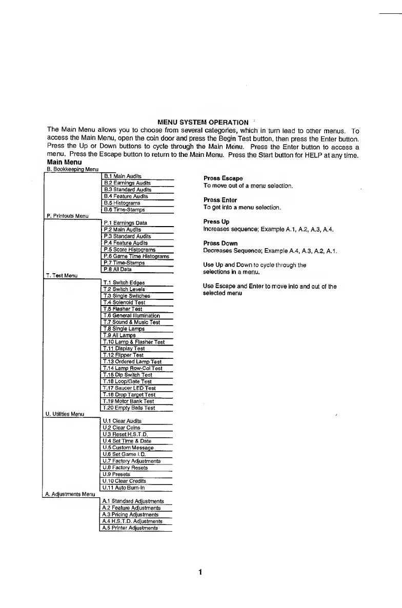 Bally ATTACK FROM MARS - Menu System Operation; Main Menu Structure and Navigation; Menu Control Functions