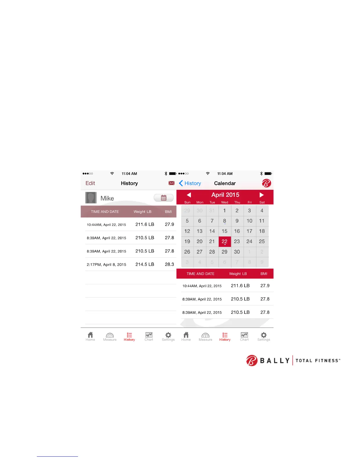 weight measurement and BMI reading. You can also view this data in calendar format by pressing on the calendar