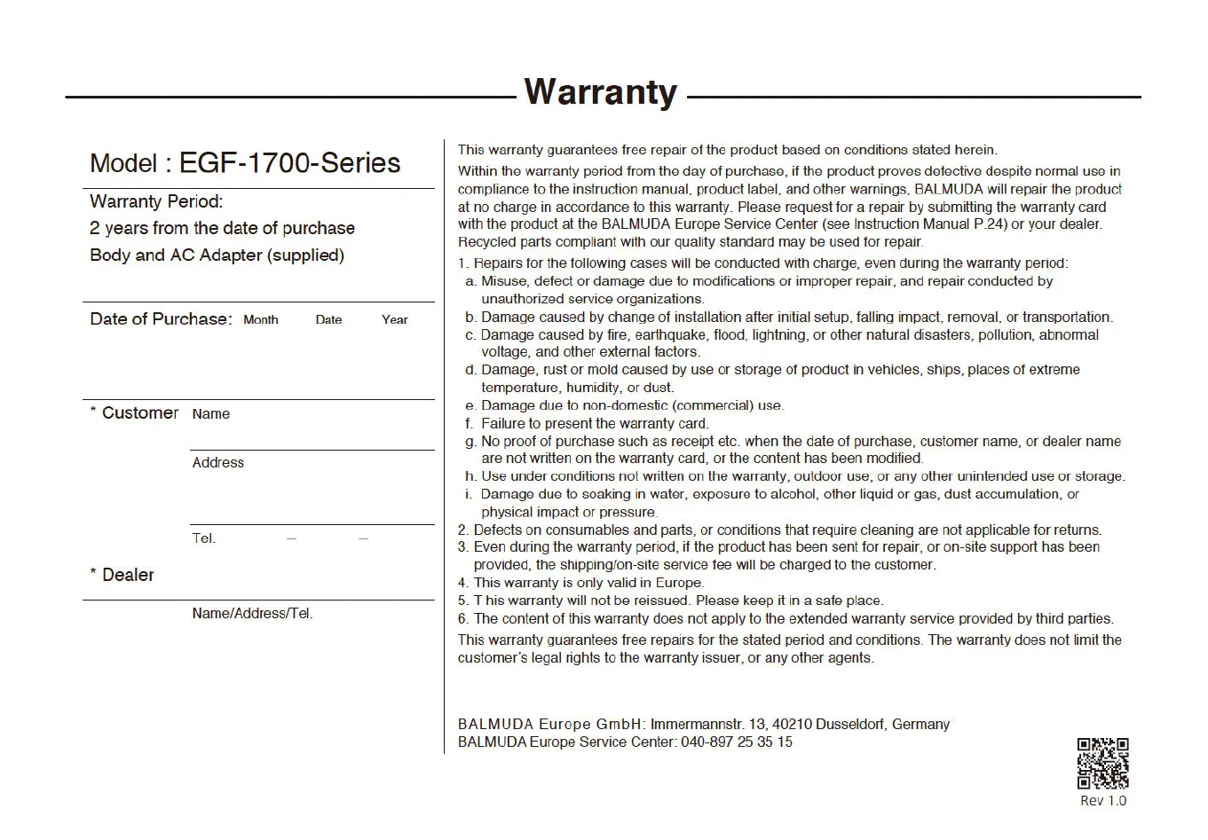 wit h t h e pr o d u ct at t h e B A L M U D A E ur o p e S er vi c e C e nt er ( s e e I n str u cti o n M a n u al P. 2 4) or y o ur d e al er.