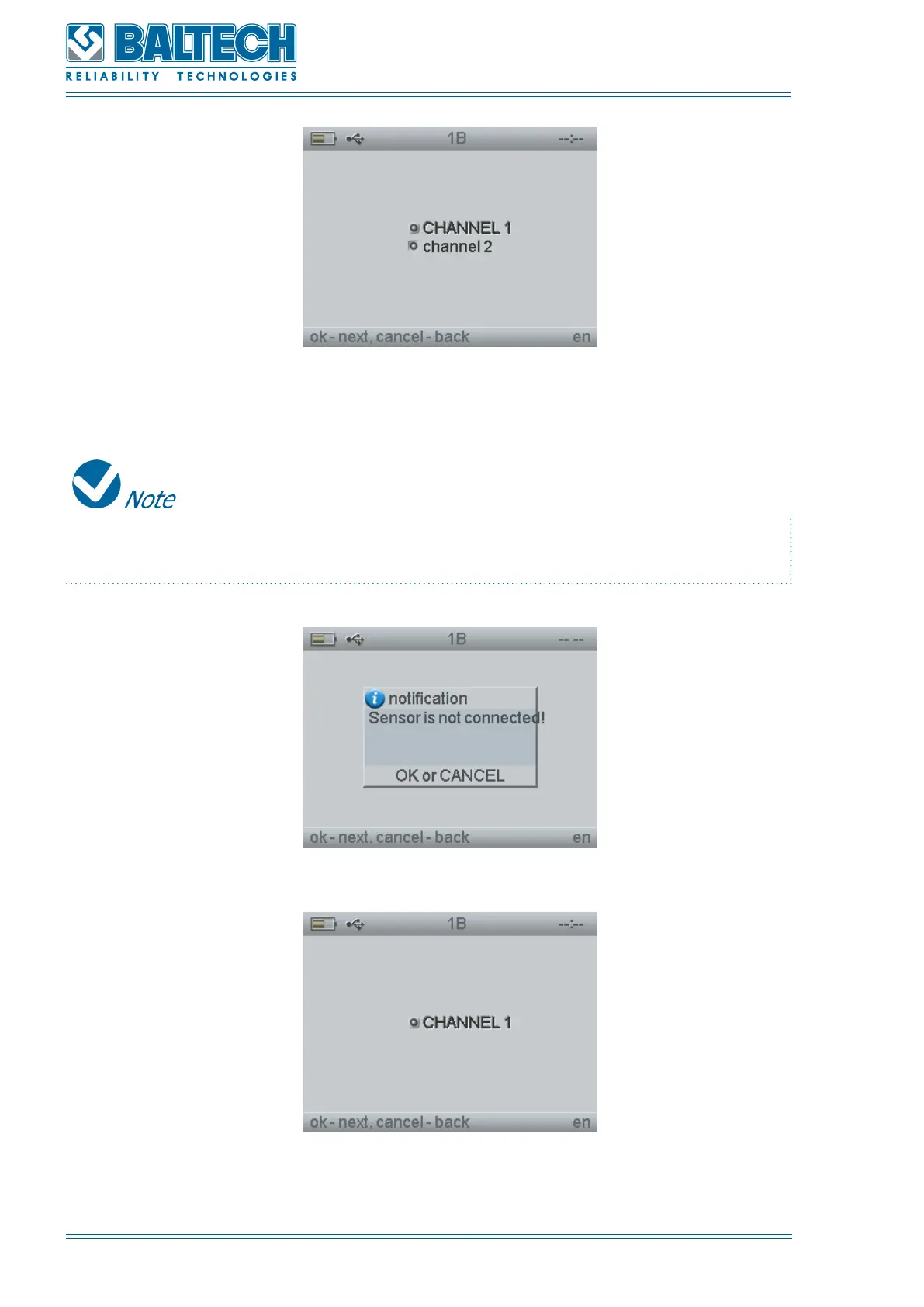 Baltech VP-3470 - Figure 39. Selection of the Measurement Channel; Figure 40. Sensor Is Not Connected; Figure 41. Confirmation of the Measurement Channel