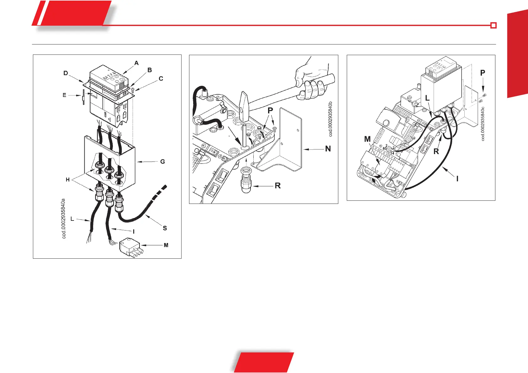 la piastrina (D) con le apposite viti (C) e stringere i pressacavi