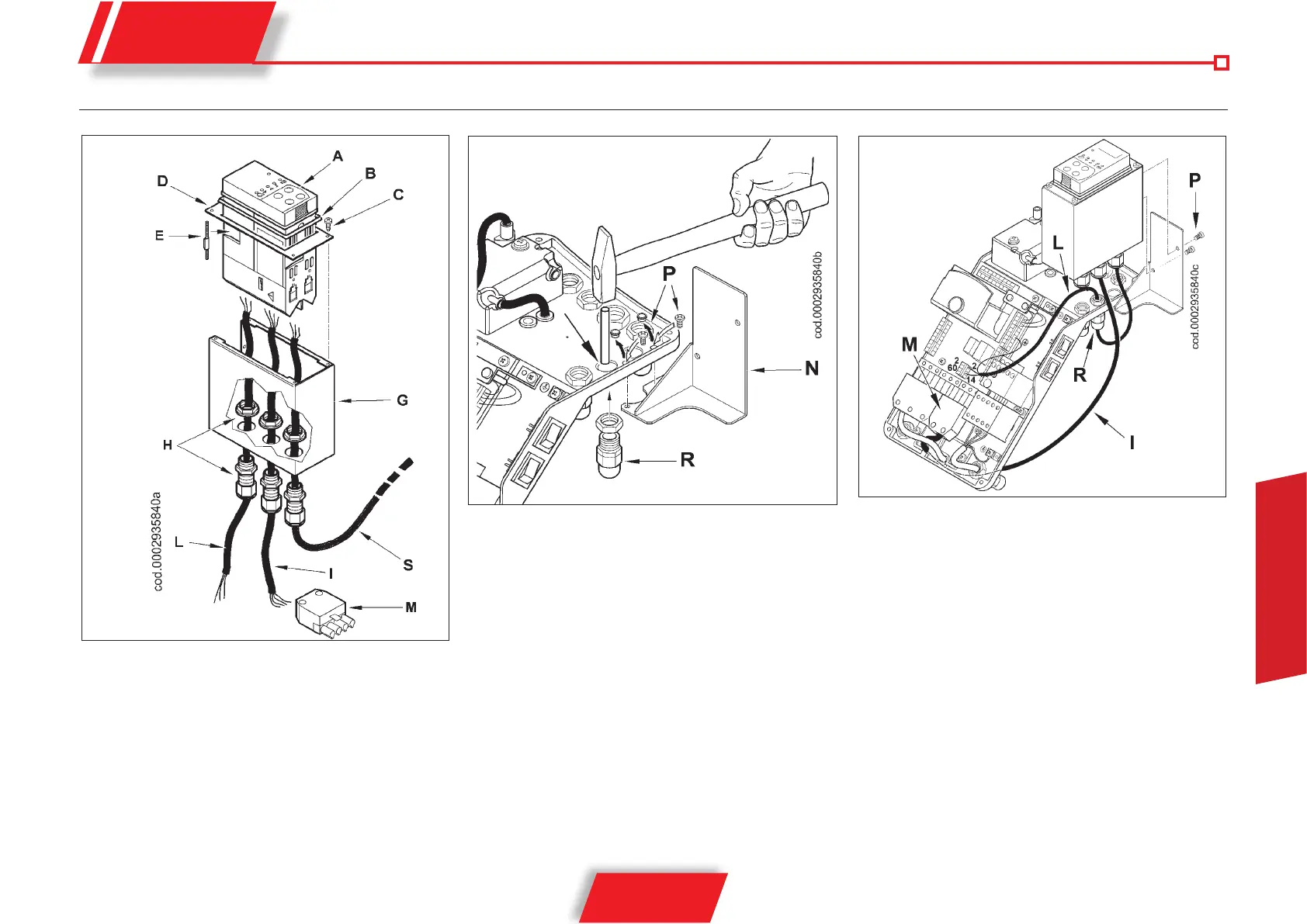 (D) con los tornillos adecuados (C) y apriete los prensacables