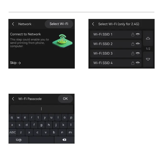 Bambu Lab A1 mini - Network Setting; Connect to Network; Select Wi-Fi Network; Input Wi-Fi Passcode