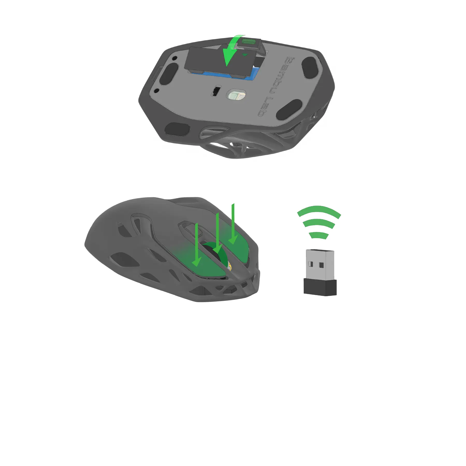 4. While holding down the left button, right button, and scroll wheel button, power on the mouse.