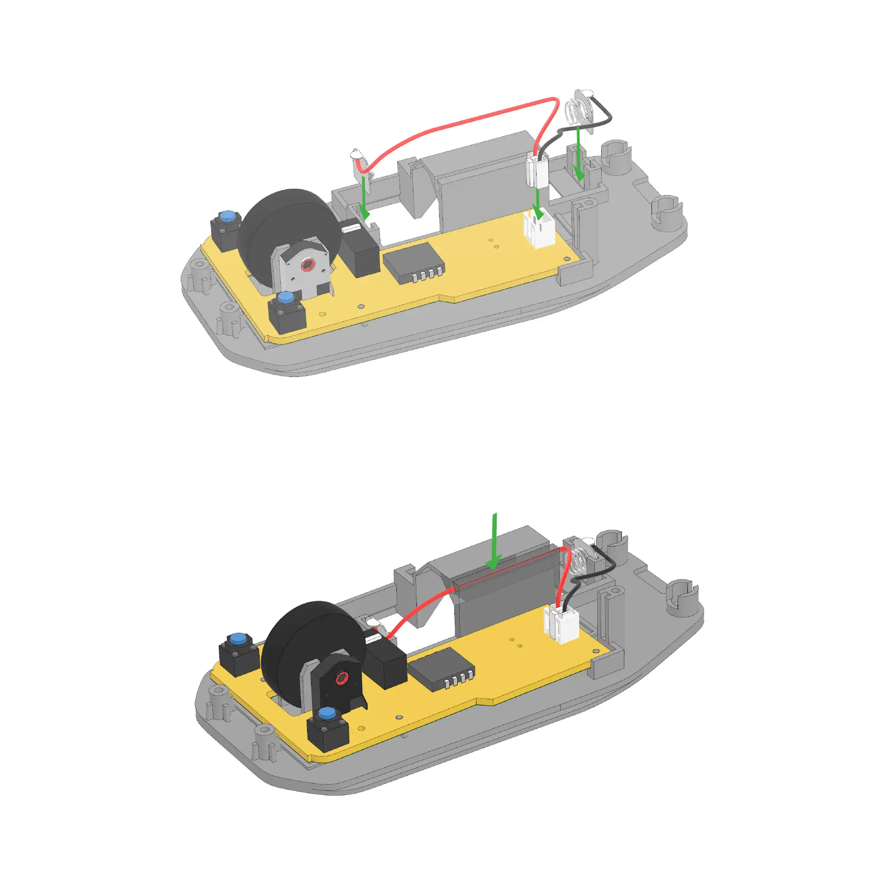 ① Inse the positive and negative terminals, as well as the socket, into their respective slots.