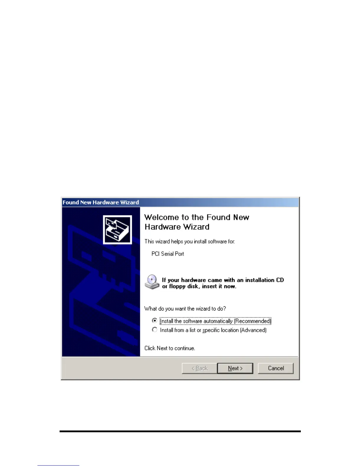 Hardware Wizard, to begin driver installation. Windows XP will
