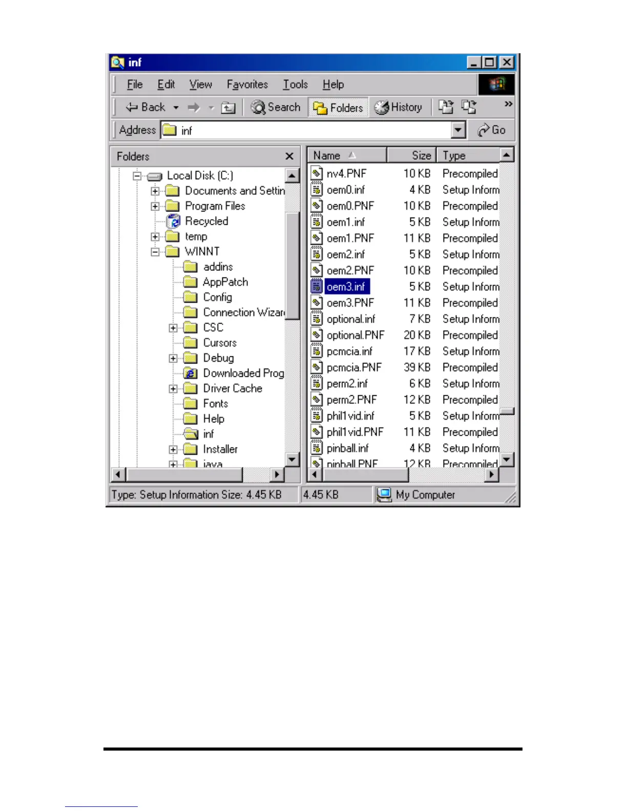 Windows Explorer, WINNT, INF, Oem2 and Oem3 files.