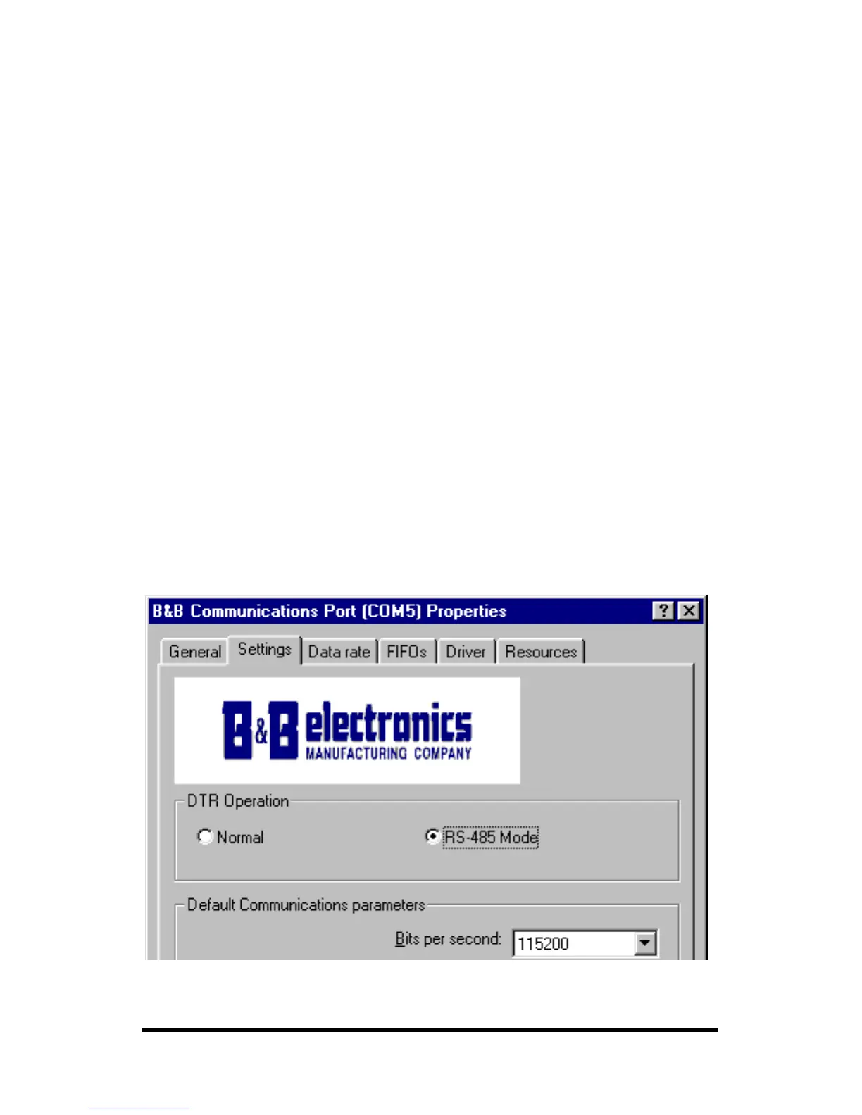 Example - Settings, DTR Operation, RS-485 Mode selected.