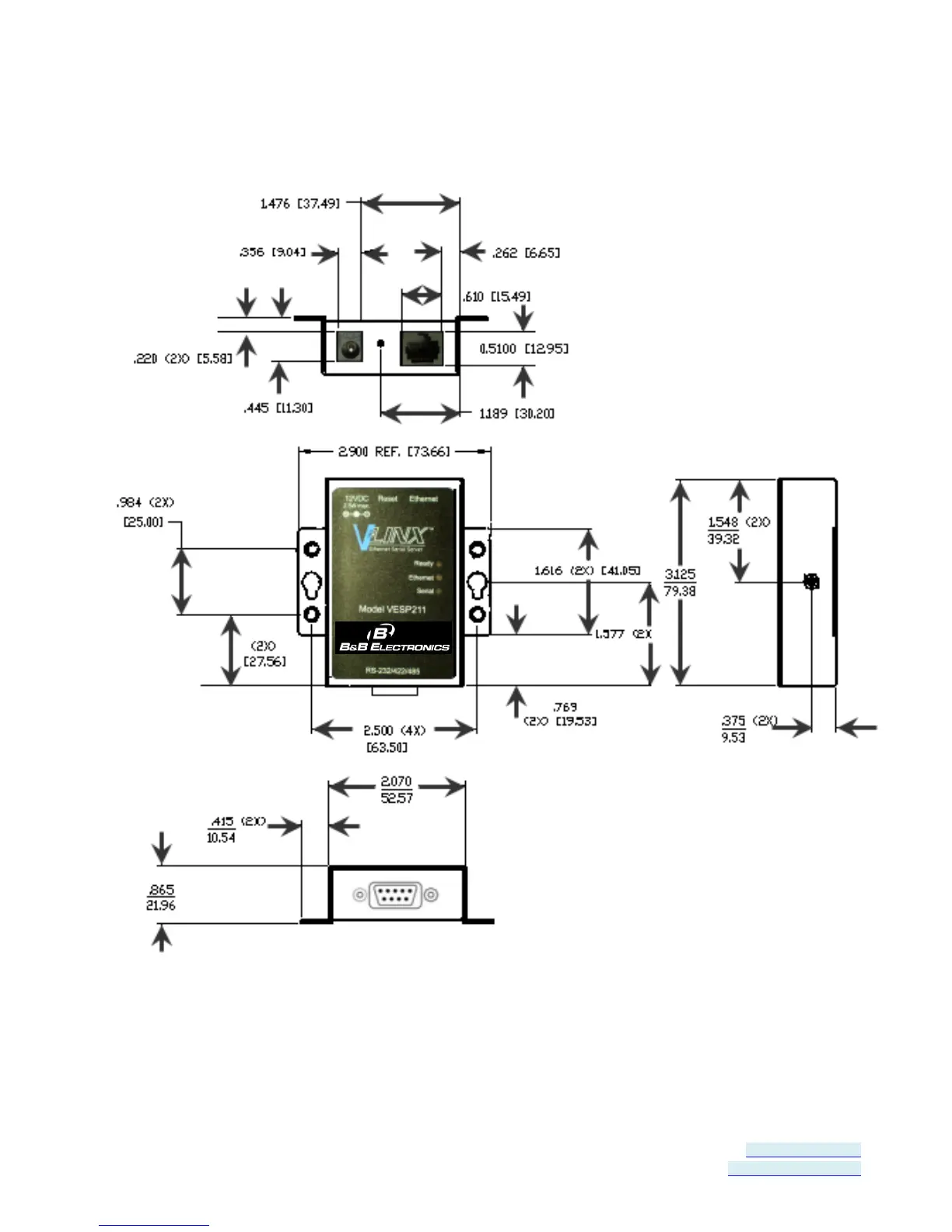 Figure 46. Dimensional Diagram of a VESP211 Serial Server (dimensions in inches & millimeters)