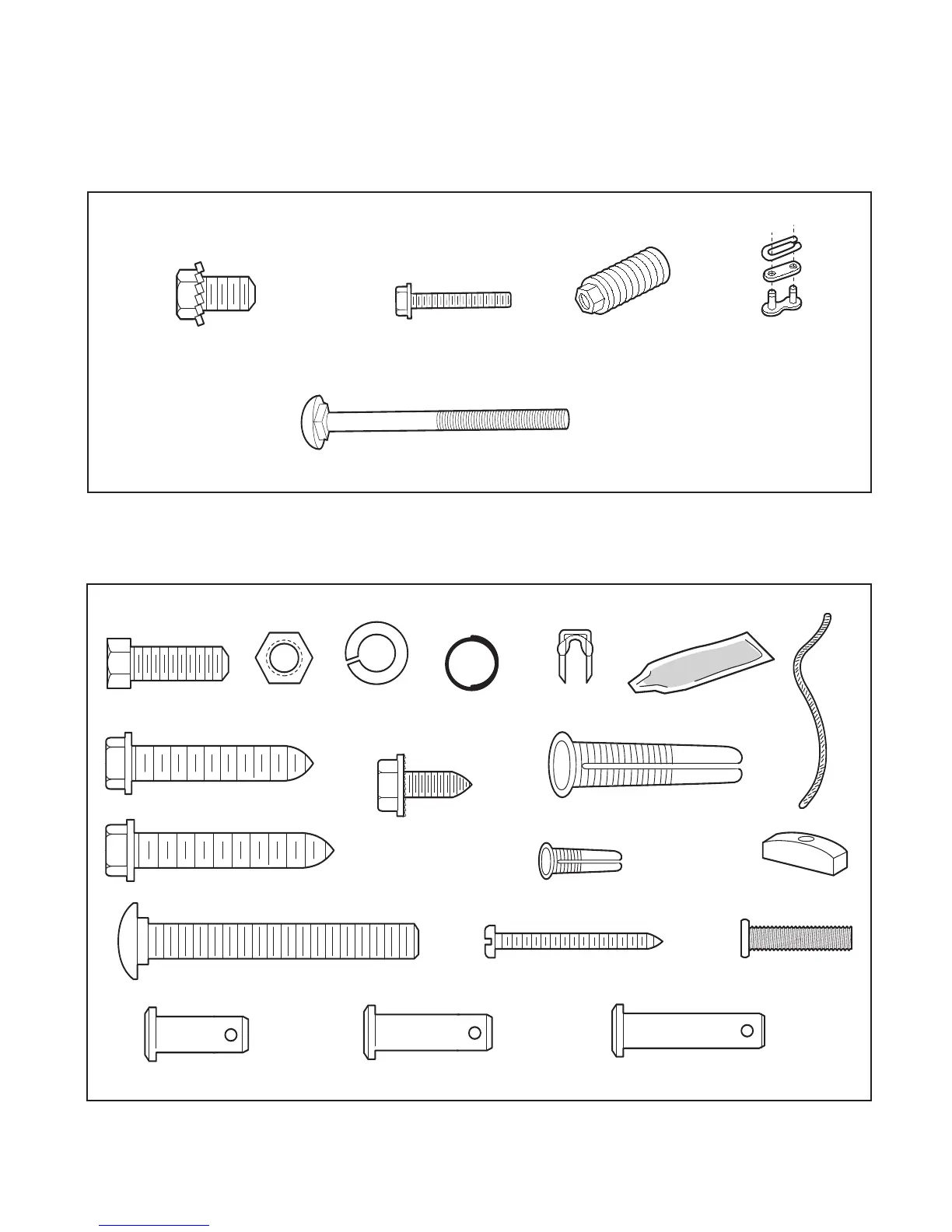 Separate all hardware and group as shown below for the assembly and installation procedures.