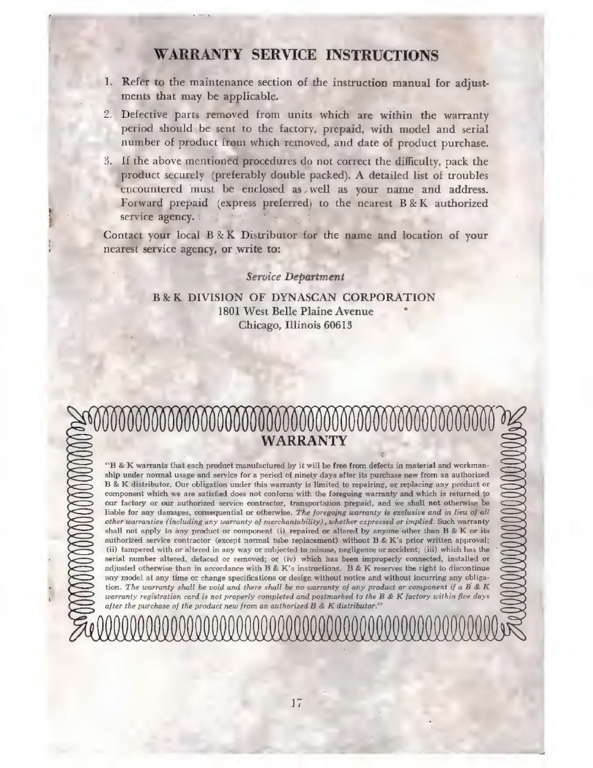 B&K 281 - Warranty and Service Information; Referencing Maintenance Section; Warranty Part Return; Product Troubleshooting and Return