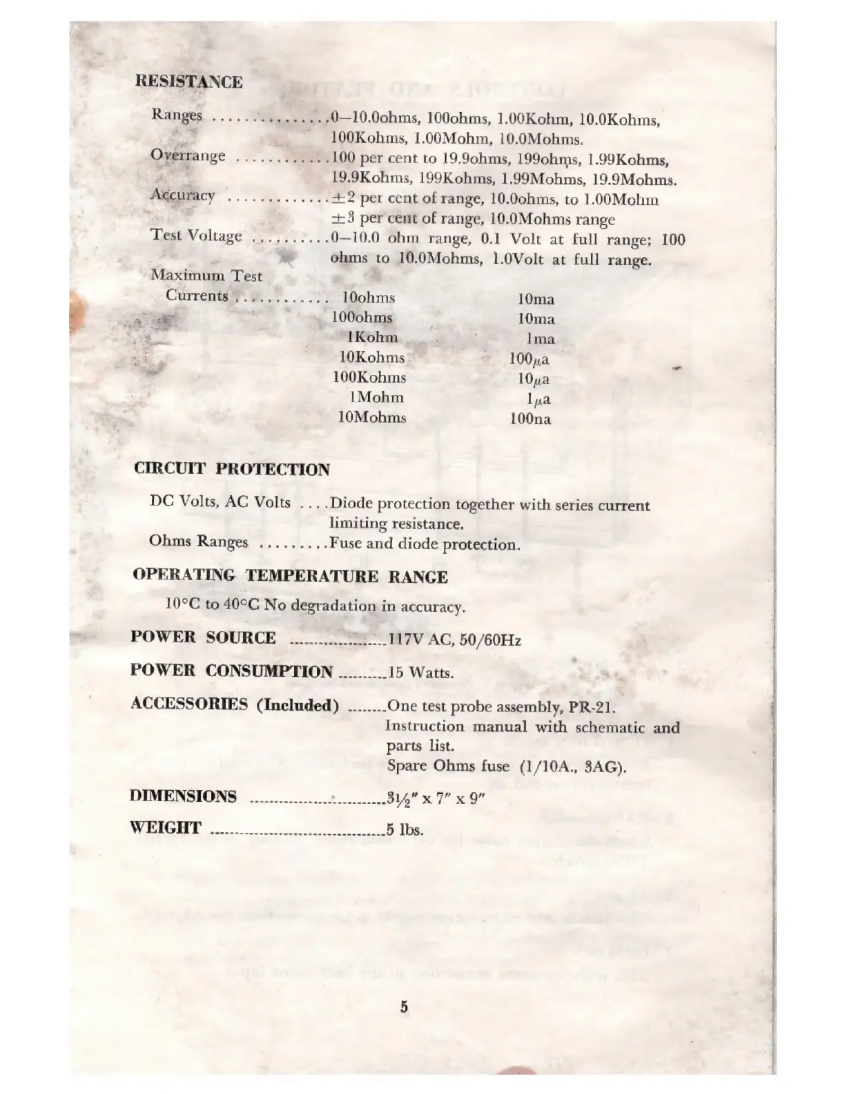 B&K 281 - Resistance Measurement Specs; Circuit Protection Details; Operational Temperature Limits; Power Source Information